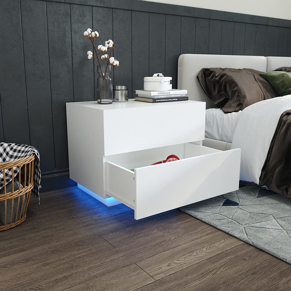 Bedside Table, LED High Gloss Bedside Table with 2 Drawers